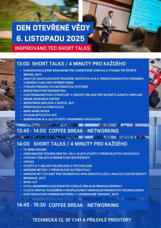 Součástí budou také neformální setkání s doktorandy, výzkumníky a vědci během přestávek, kde se zájemci mohou dozvědět více o možnostech zapojení do výzkumných týmů.